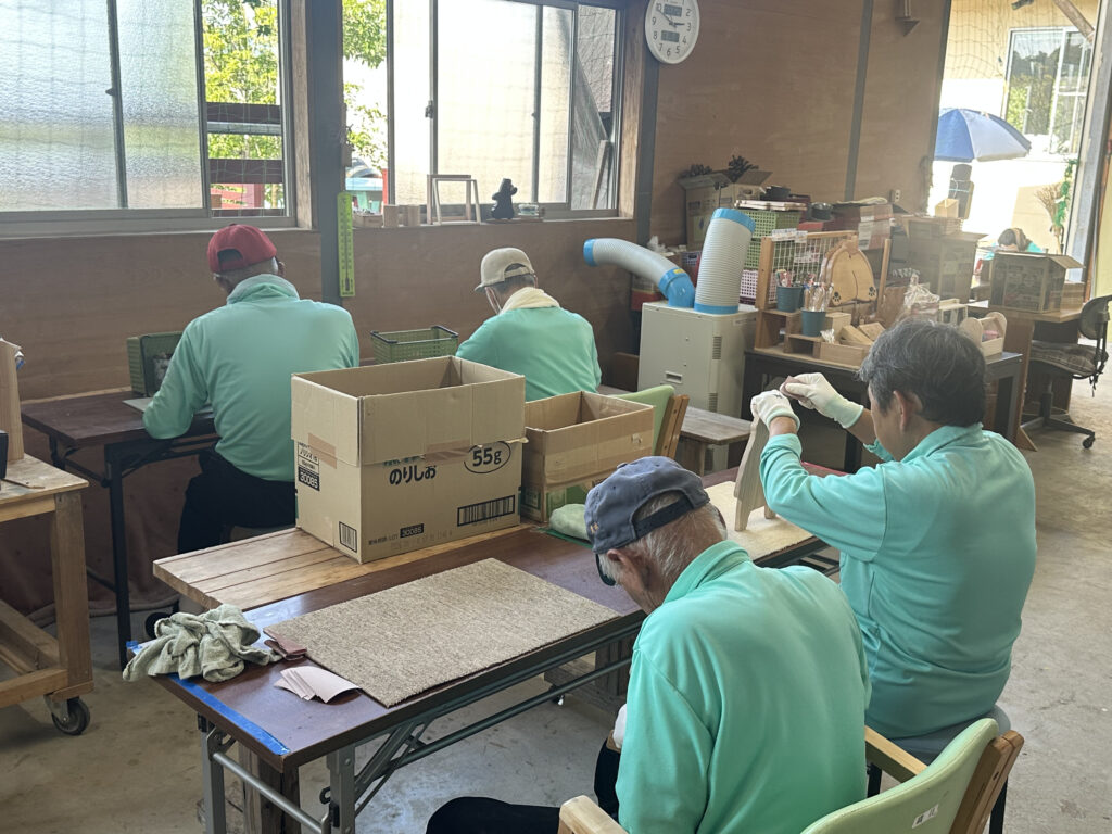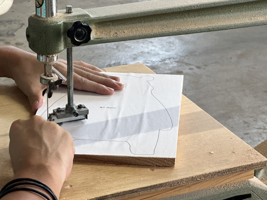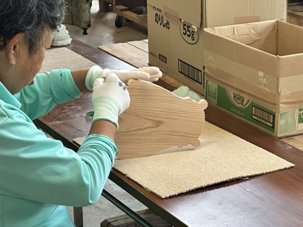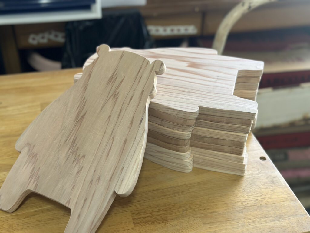 製作には、あさぎり町にある就労継続支援B型事業所「まろん工房」にもご協力いただき、スギの木の板から丁寧にくまモン型への切り出しとやすり掛け作業をしていただきました。