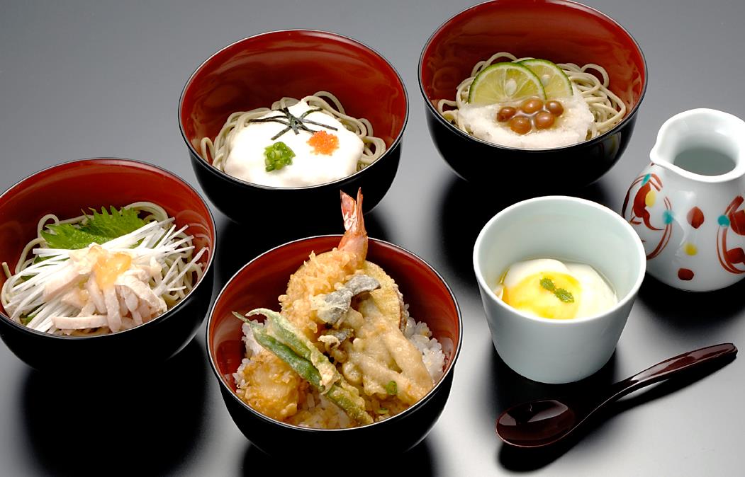 3種類の冷たいおそばのお椀と小天丼の御膳 ※デザートに熊本産の牛乳を使用