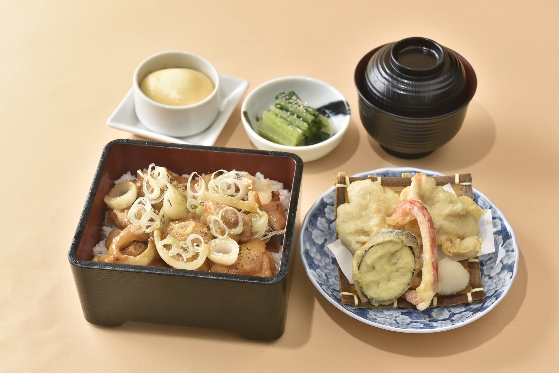 12Fしゃぶしゃぶ・日本料理 たちばな 肥後の赤鶏 肥後赤鶏御膳2,500円(税込)1日限定10引き締まってしっかりとした弾力で歯ごたえのある赤鶏のもも肉を朴葉味噌で炒めご飯の上にのせ、むね肉を天ぷらにしました。赤鶏の濃厚な風味と深いコクをお楽しみ下さいませ。