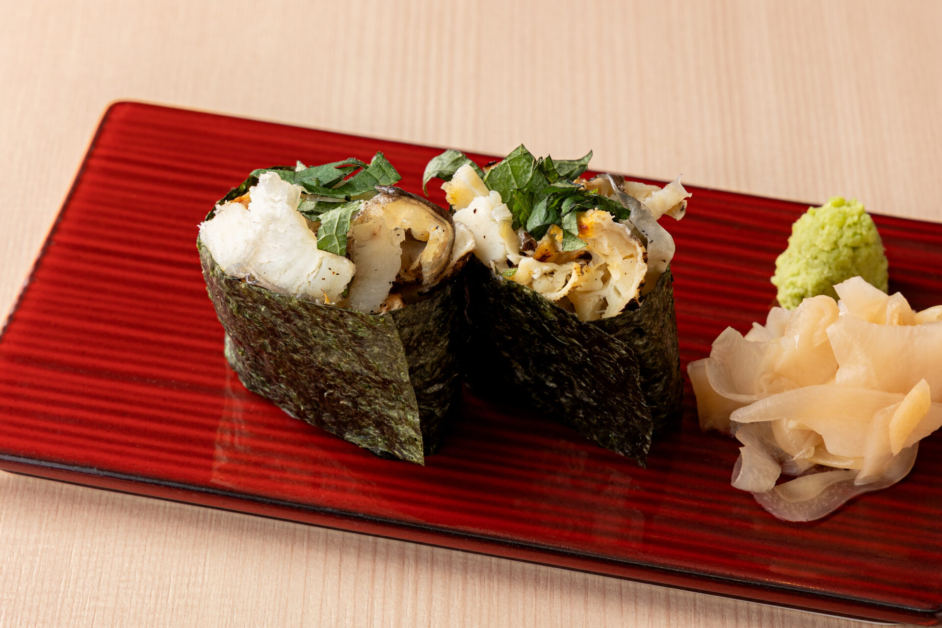 北館6FSUSHIBAR 華美 はも 熊本県産はもの炙り軍艦2貫 880円(税込)オールタイム提供熊本県が誇る極上のはもを、匠の技で丹念に炙り上げました。香ばしさと奥深い旨味が際立つこの逸品は、伝統と革新が融合した至高の軍艦寿司。豊かなはもの香りとシャリの酸味が見事に調和し、食通をも唸らせる深い味わいをご堪能いただけます。