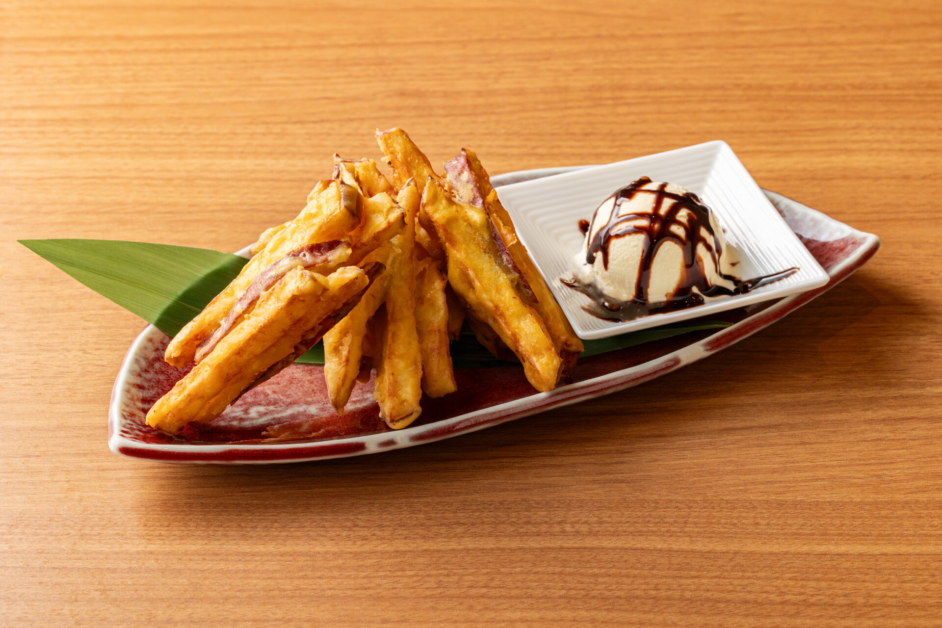 10F ルクアダイニングうなぎ徳大阪店 さつまいも 郷土料理 『がねあげ』990円(税込)『がね』とはカニの方言です。揚げた姿がカニの足に見えることから名付けられました。カリッと揚げた衣とホクホクしたさつまいもは絶品です。